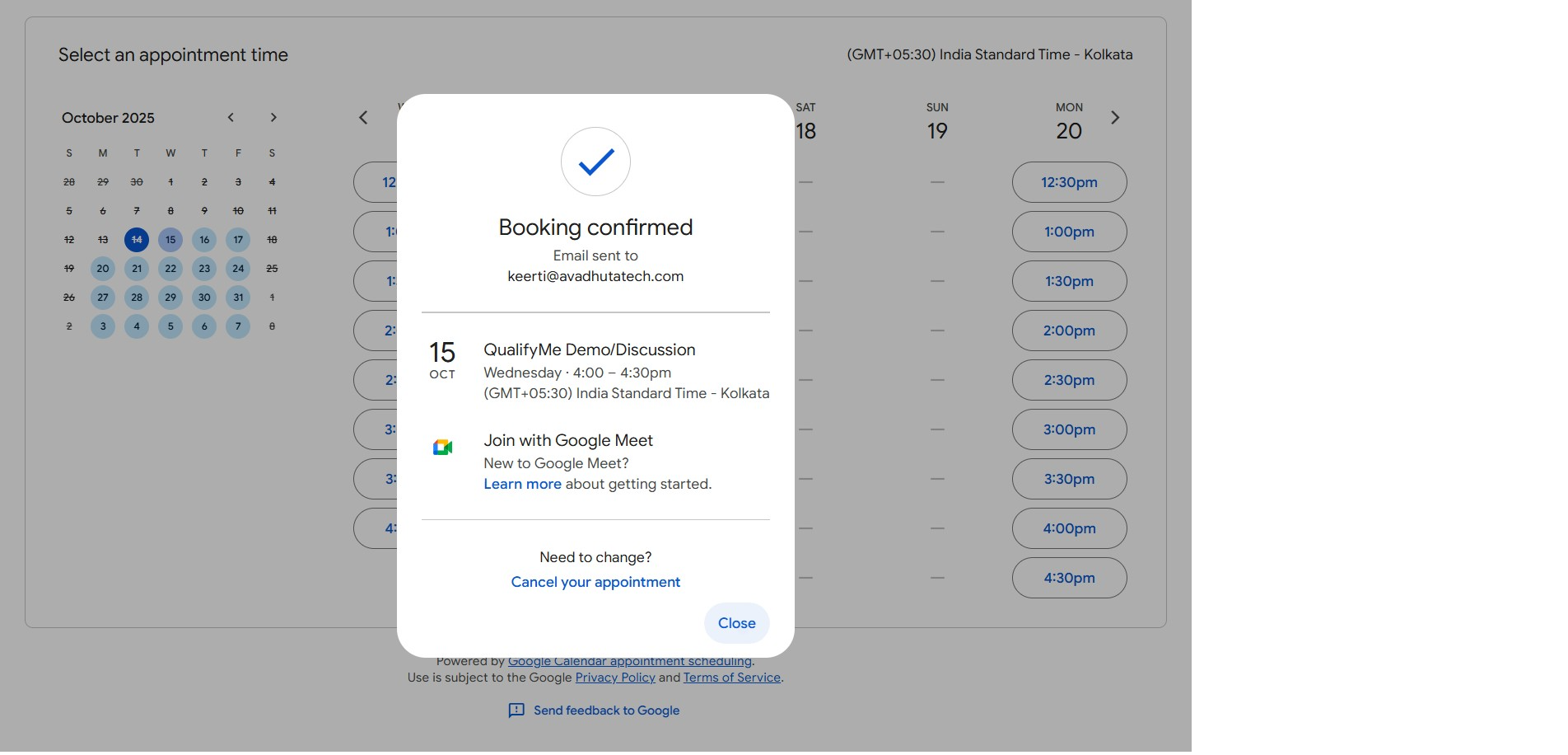 Review the confirmation message displayed on the screen to ensure the 'QualifyMe Demo/Discussion' for Wednesday, 15 October, has been successfully booked.