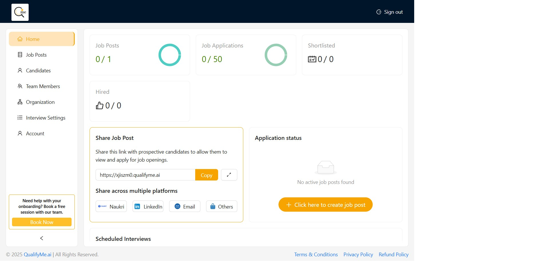 From the QualifyMe dashboard, click the 'Book Now' button located in the left sidebar section asking for onboarding help.
