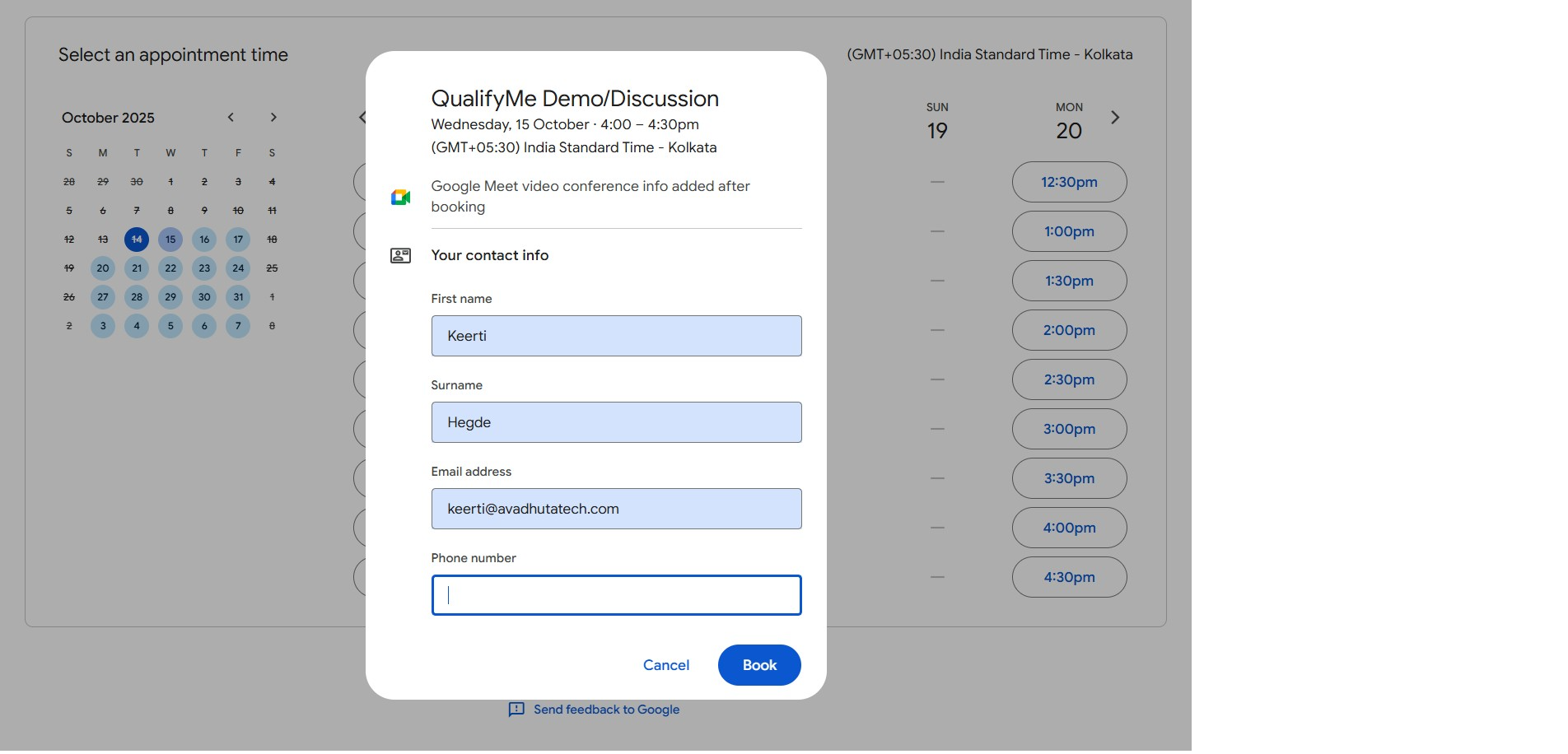 After entering all contact details, click the 'Book' button to finalize the appointment reservation.
