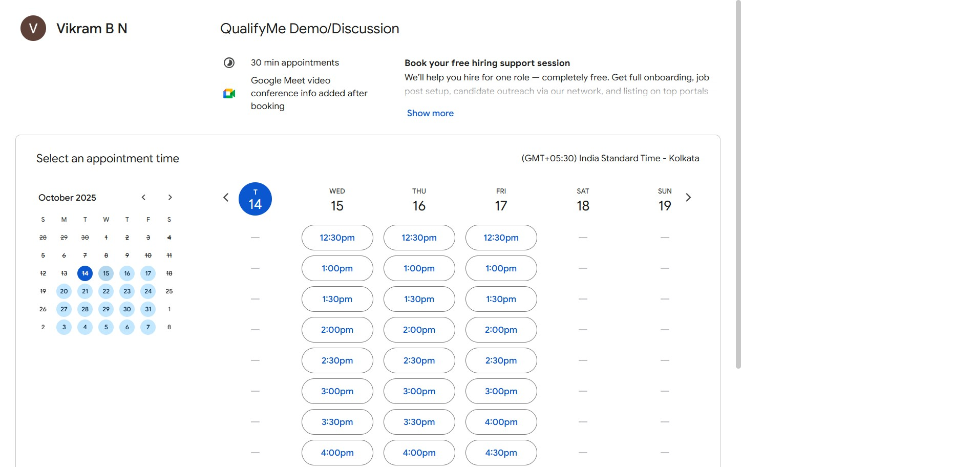This guide demonstrates the process of booking a free support session by navigating the QualifyMe dashboard, selecting a date and time on the external scheduling tool, and confirming the appointment details.