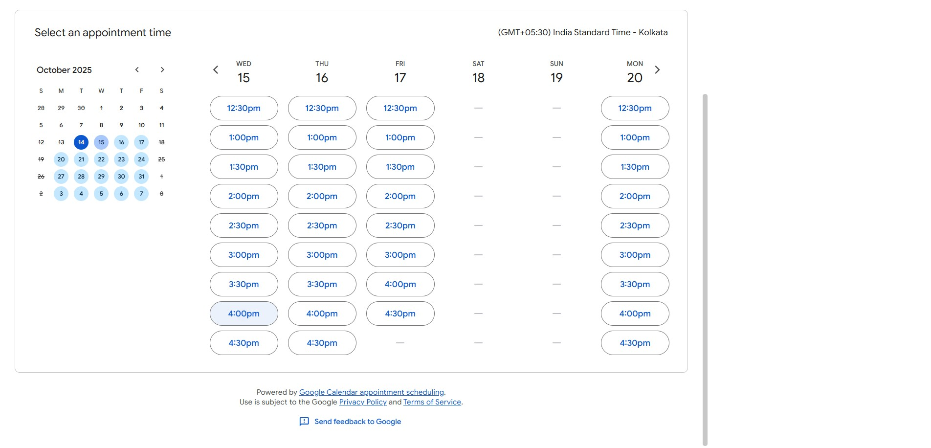 On the external calendar scheduling page, select the 15th of October as the desired date for the appointment.
