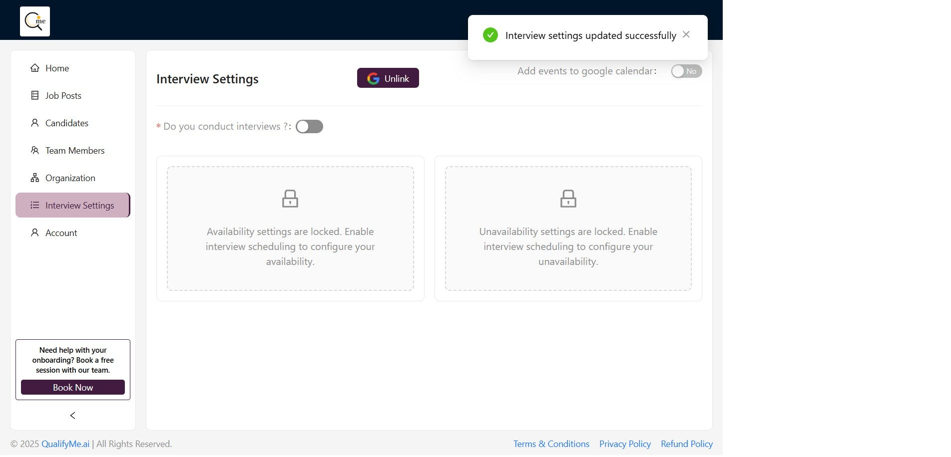 On the Interview Settings page, locate the toggle switch next to 'Do you conduct interviews?' and click it to turn it ON, which enables interview scheduling.