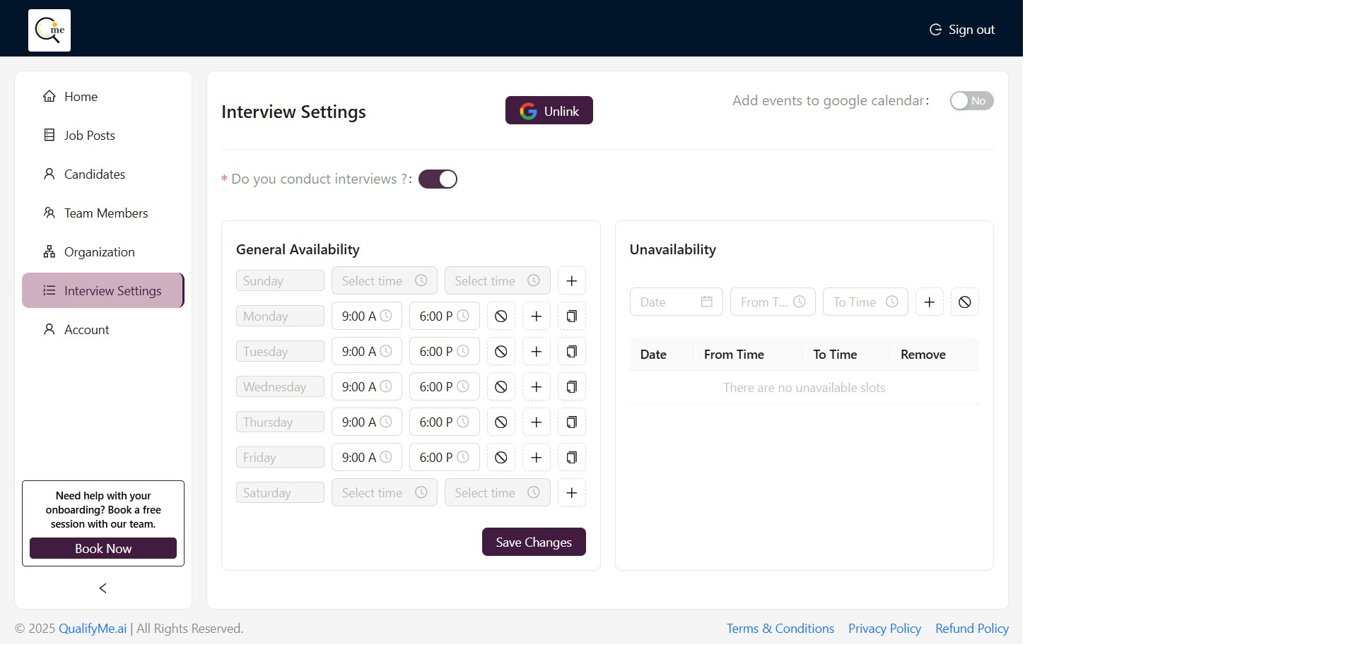 After setting the desired availability, click the 'Save Changes' button to finalize and apply the new interview schedule.