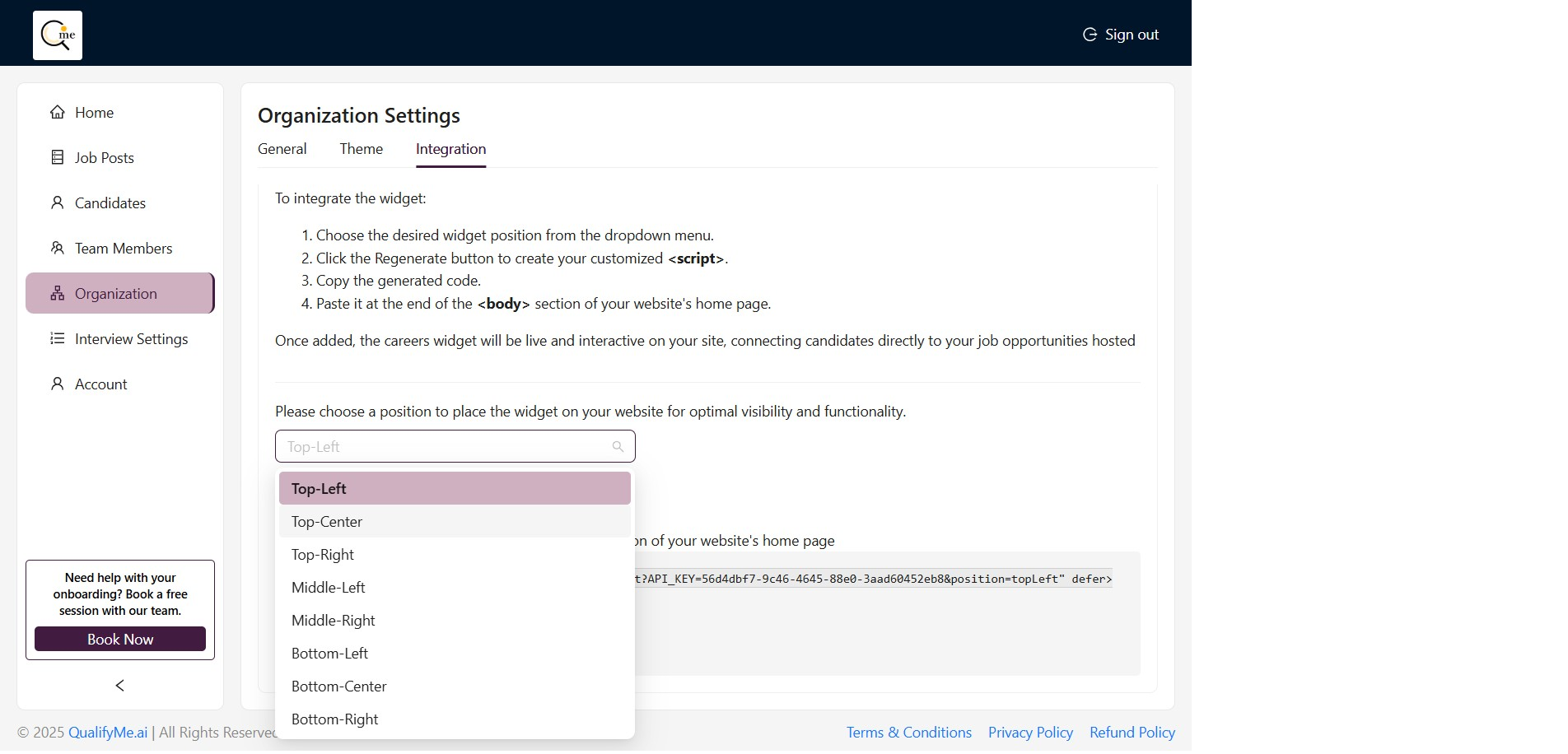 This guide details the process of navigating to the Organization Settings in QualifyMe, specifically focusing on configuring the widget integration by selecting a position and regenerating the necessary script code.
