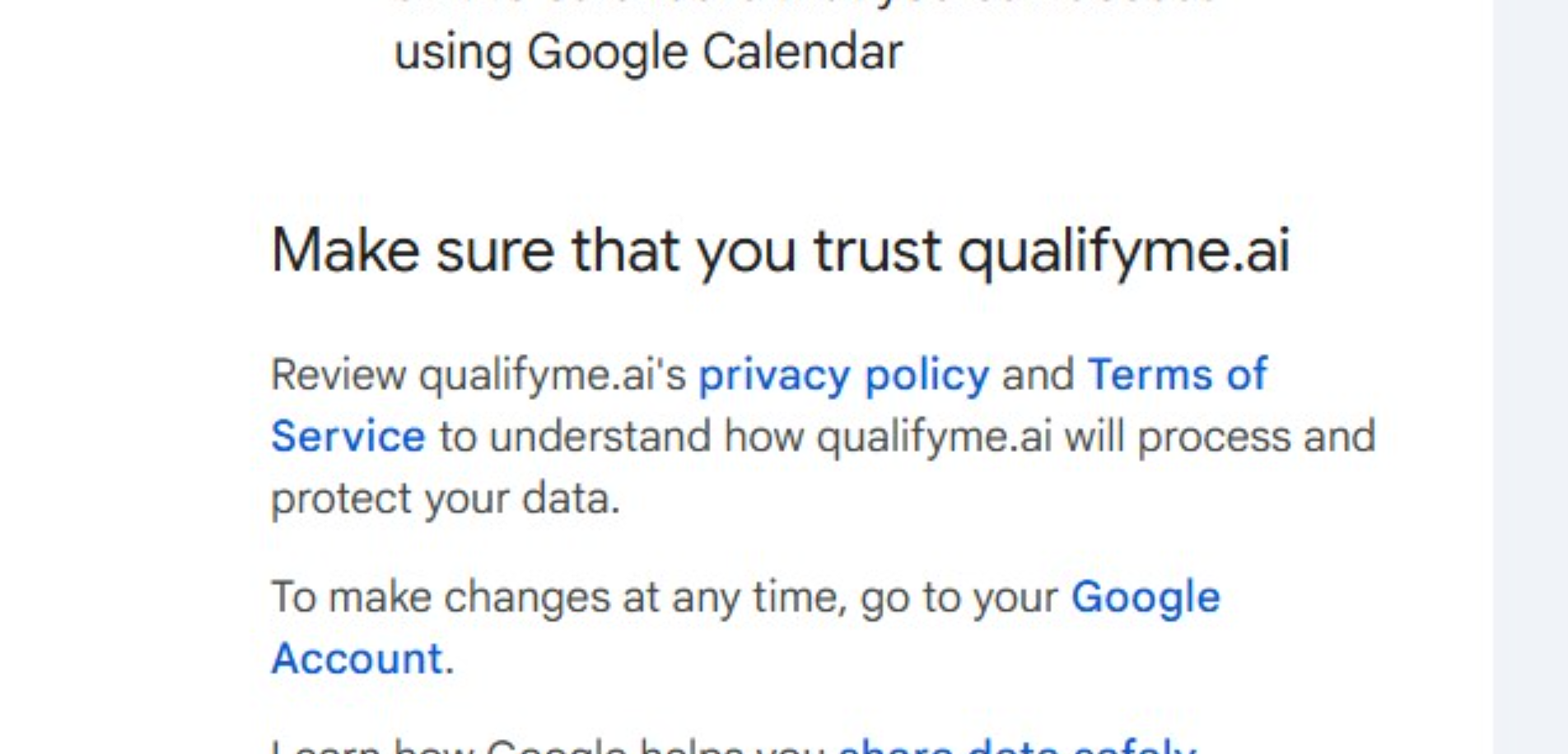 Review the permissions QualifyMe is requesting and click 'Allow' to grant access to your Google Calendar.