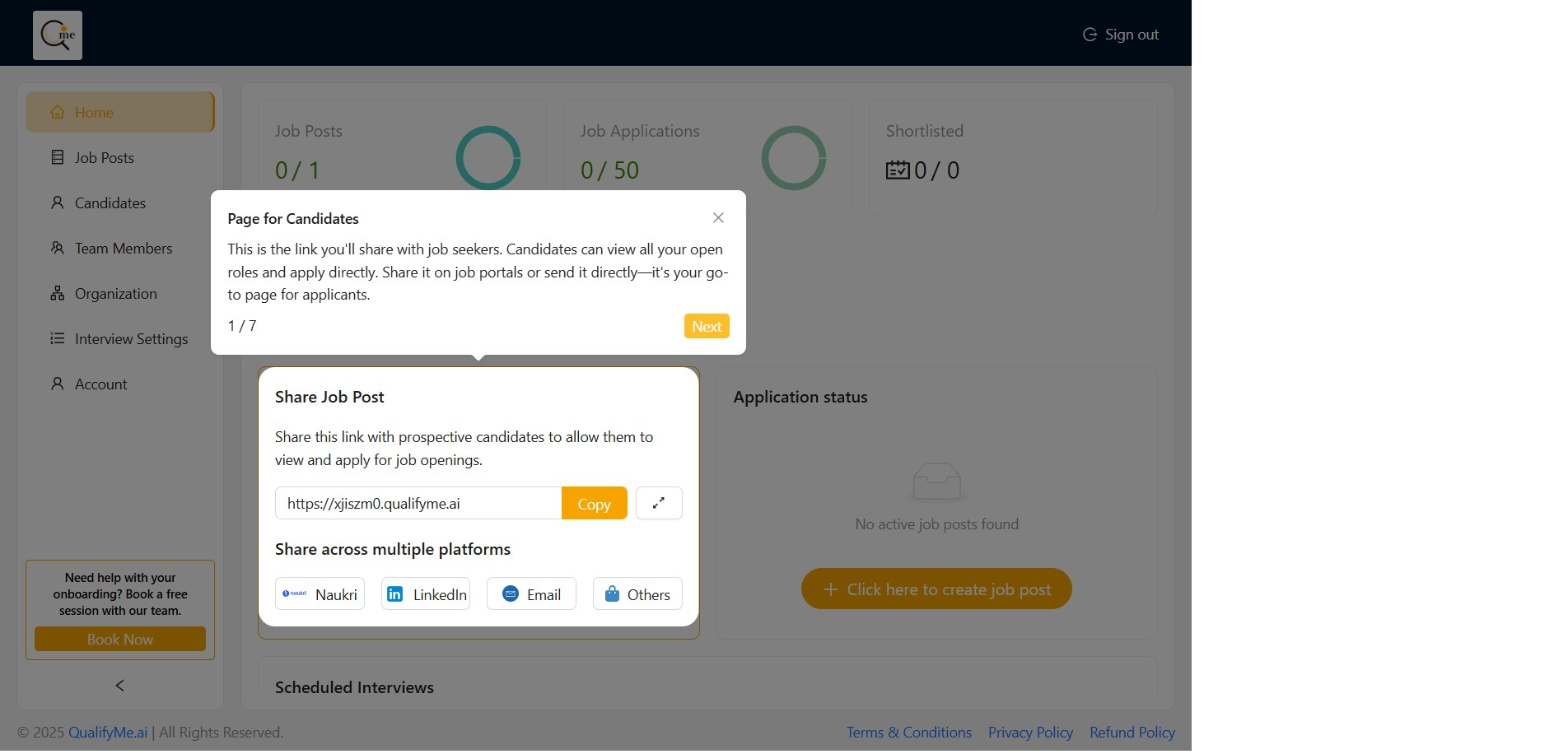 A pop-up appears showing the link to share with job seekers. Click 'Next' to proceed to the next step of the onboarding tour.