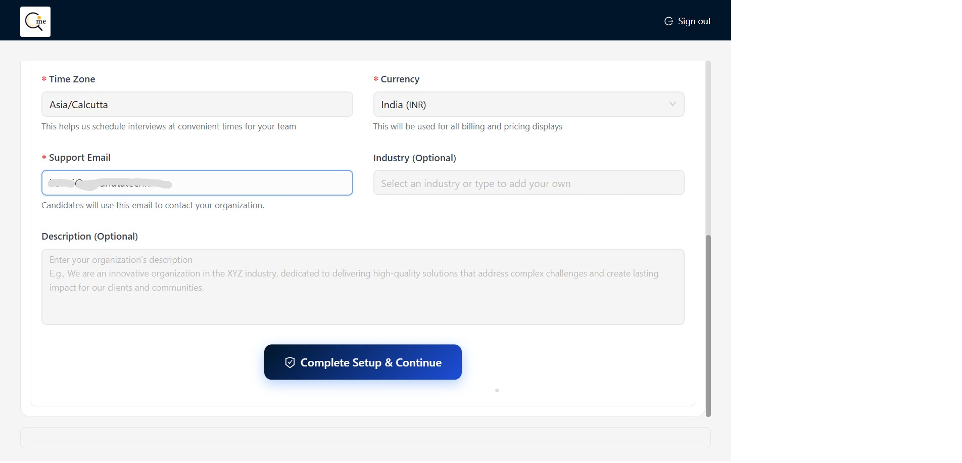 Click the 'Complete Setup & Continue' button to save the organization details and move to the next step.