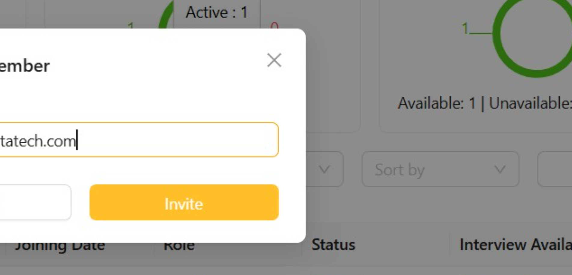 The 'Invite Team Member' dialog box appears, prompting for the email address of the new member.