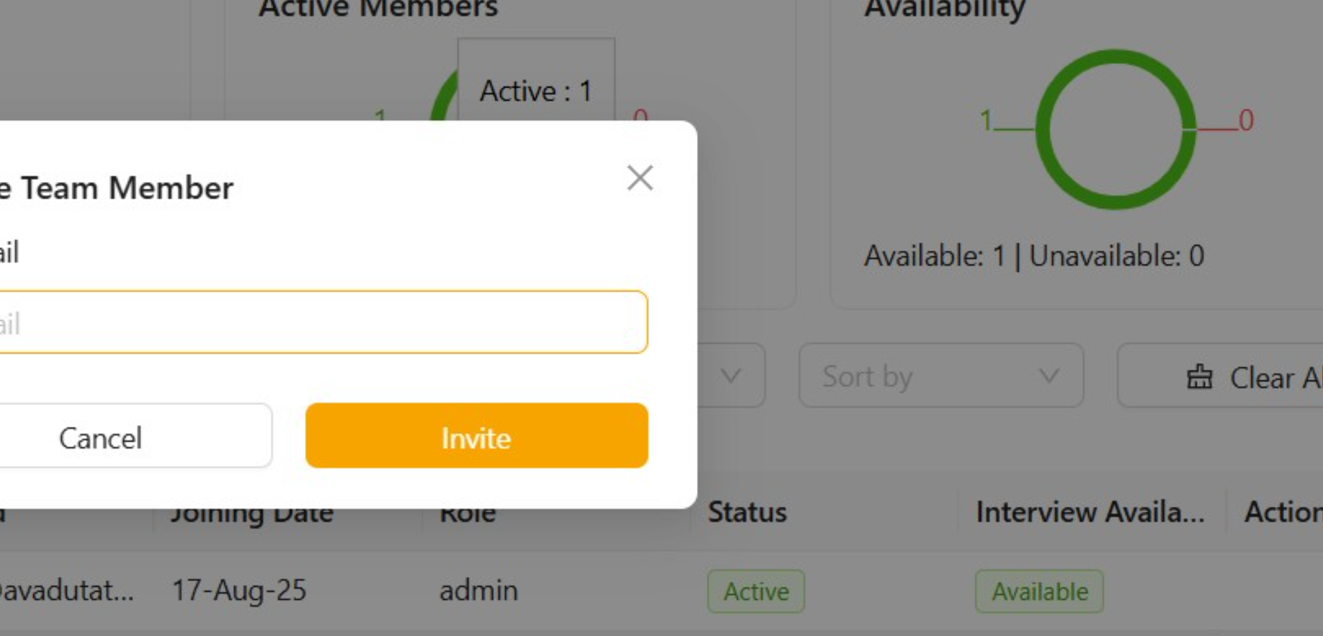 Ensure the cursor is active within the 'Email' input field in the 'Invite Team Member' dialog.