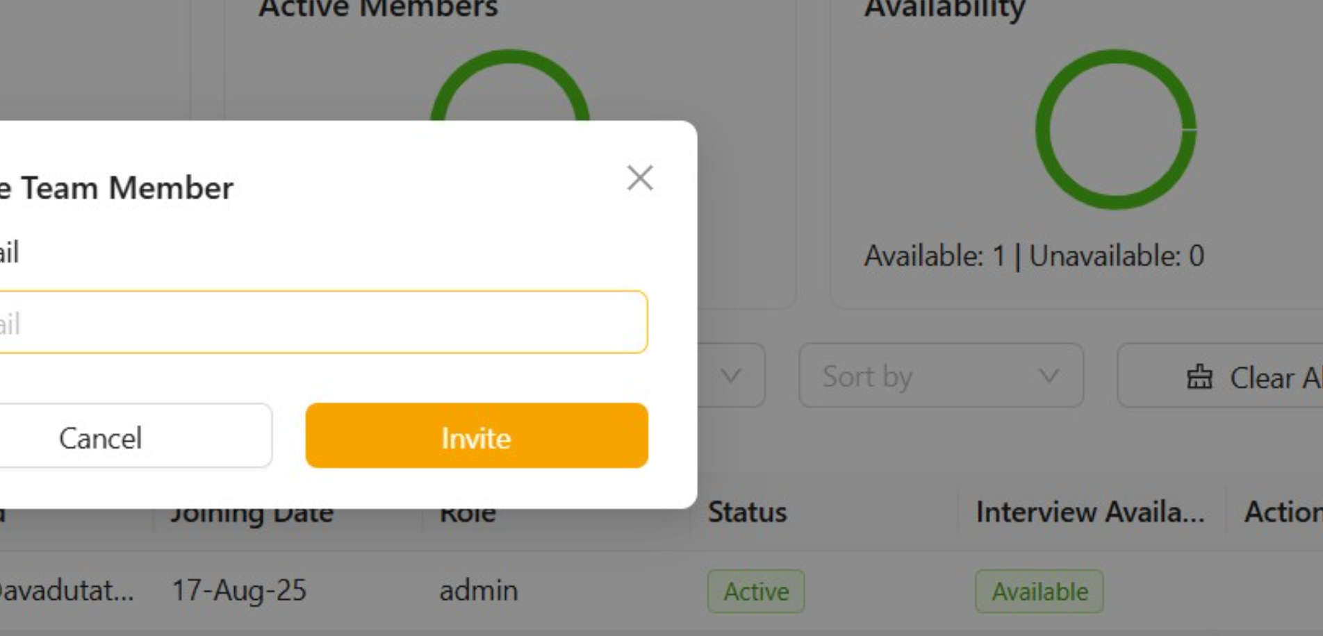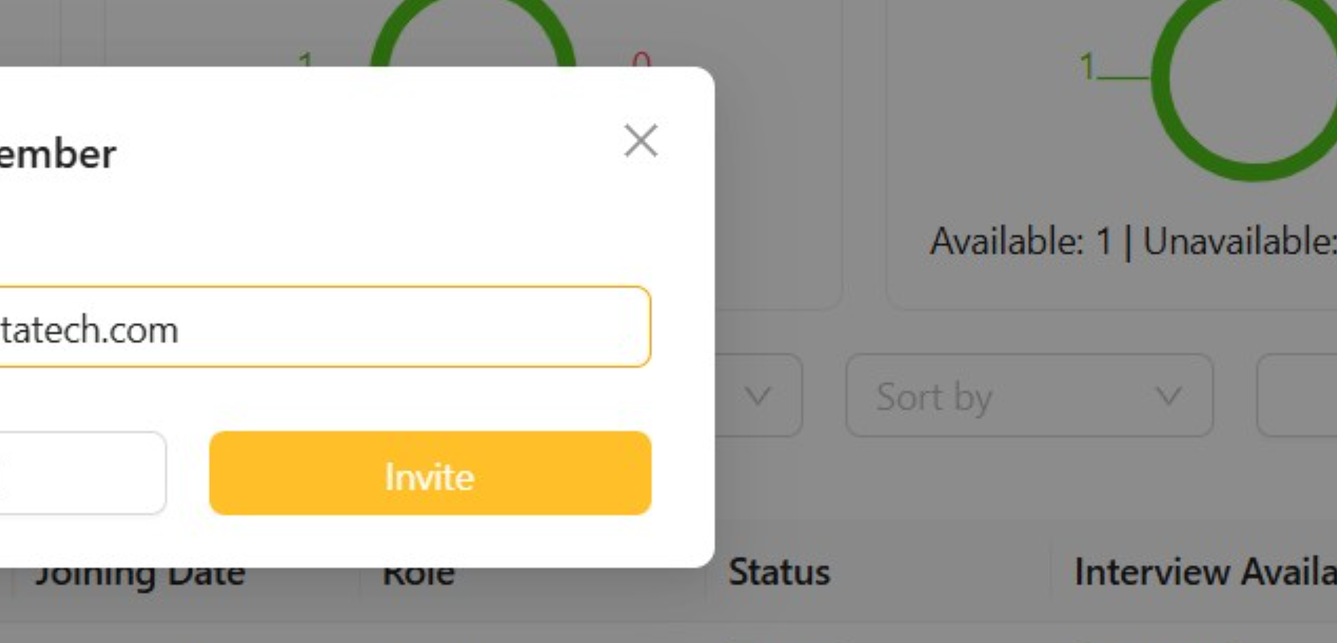 In the 'Invite Team Member' dialog box that appears, input the email address of the person you wish to invite into the 'Email' field.