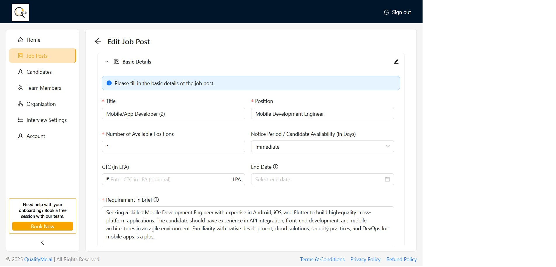 Click the edit icon (pencil) in the top right corner of the 'Basic Details' section to open the 'Edit Job Post' screen.