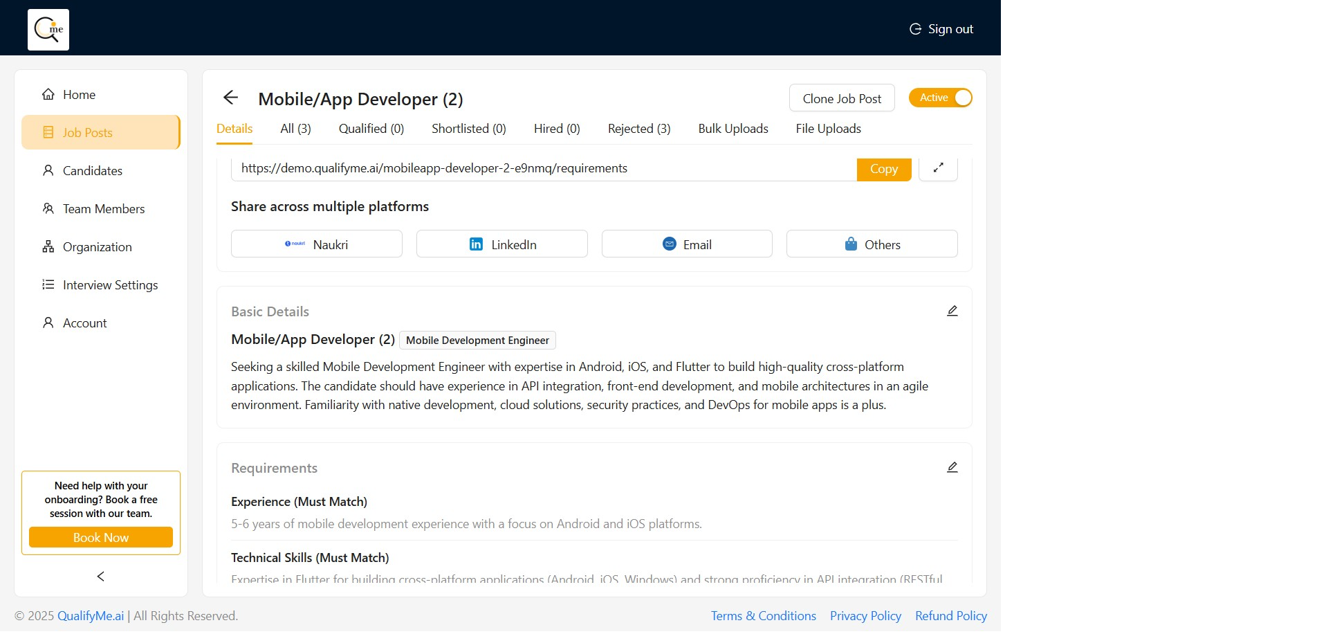 The detailed view for the 'Mobile/App Developer (2)' job post is displayed, showing basic details and requirements.