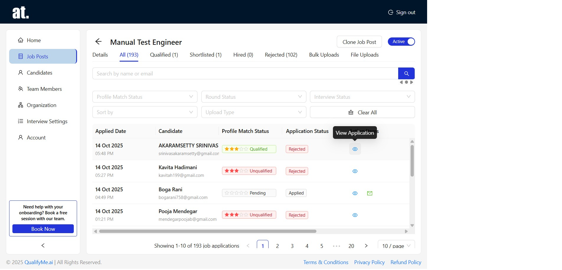 Click on the 'All (193)' tab to see the complete list of applications for the Manual Test Engineer role.