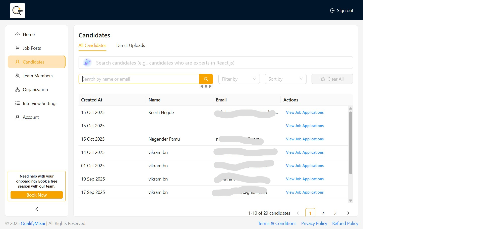 The system displays the 'All Candidates' list, showing initial entries with details like creation date, name, and email.