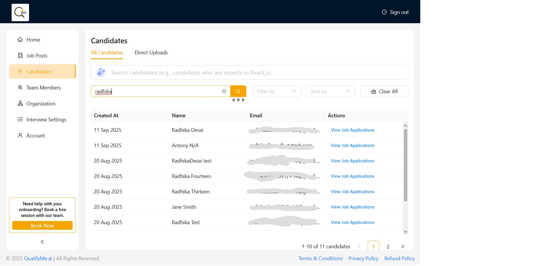 Type a search term, in this case, 'radhika', into the search bar provided at the top of the candidate list and initiate the search to filter the results.