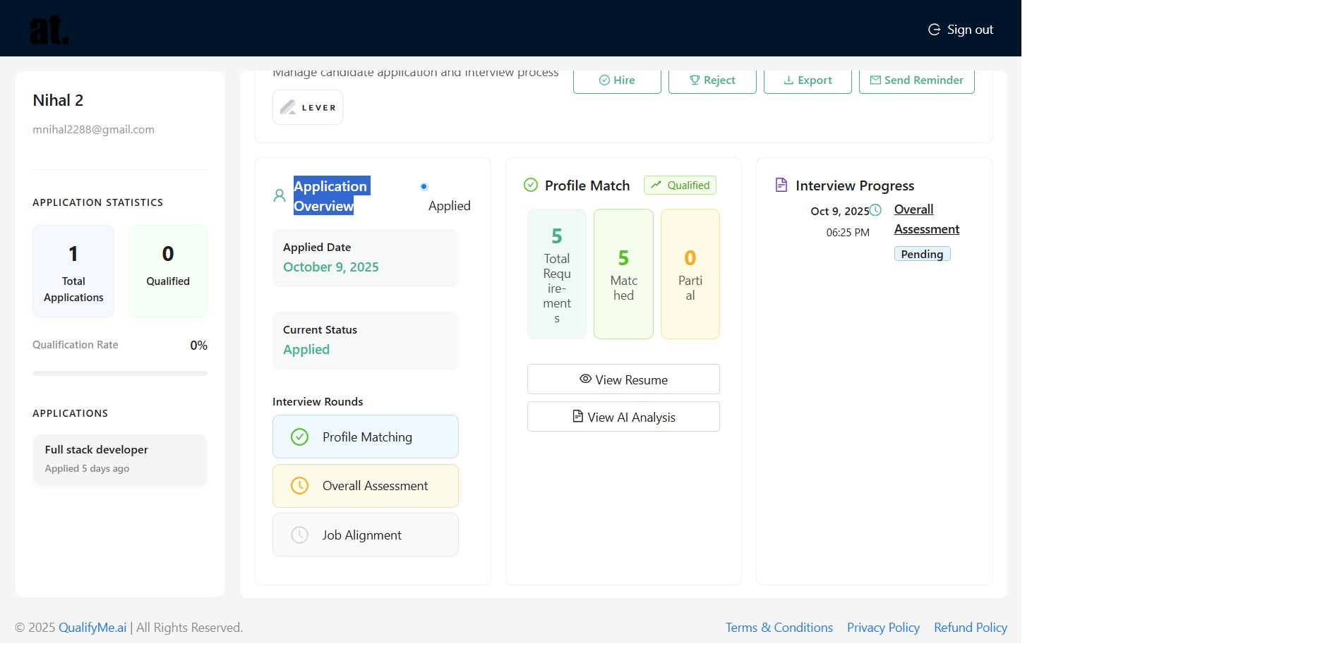 Examine the 'Application Overview' section to see key details such as the applied date, current status, and match statistics for the 'Full stack developer' role.