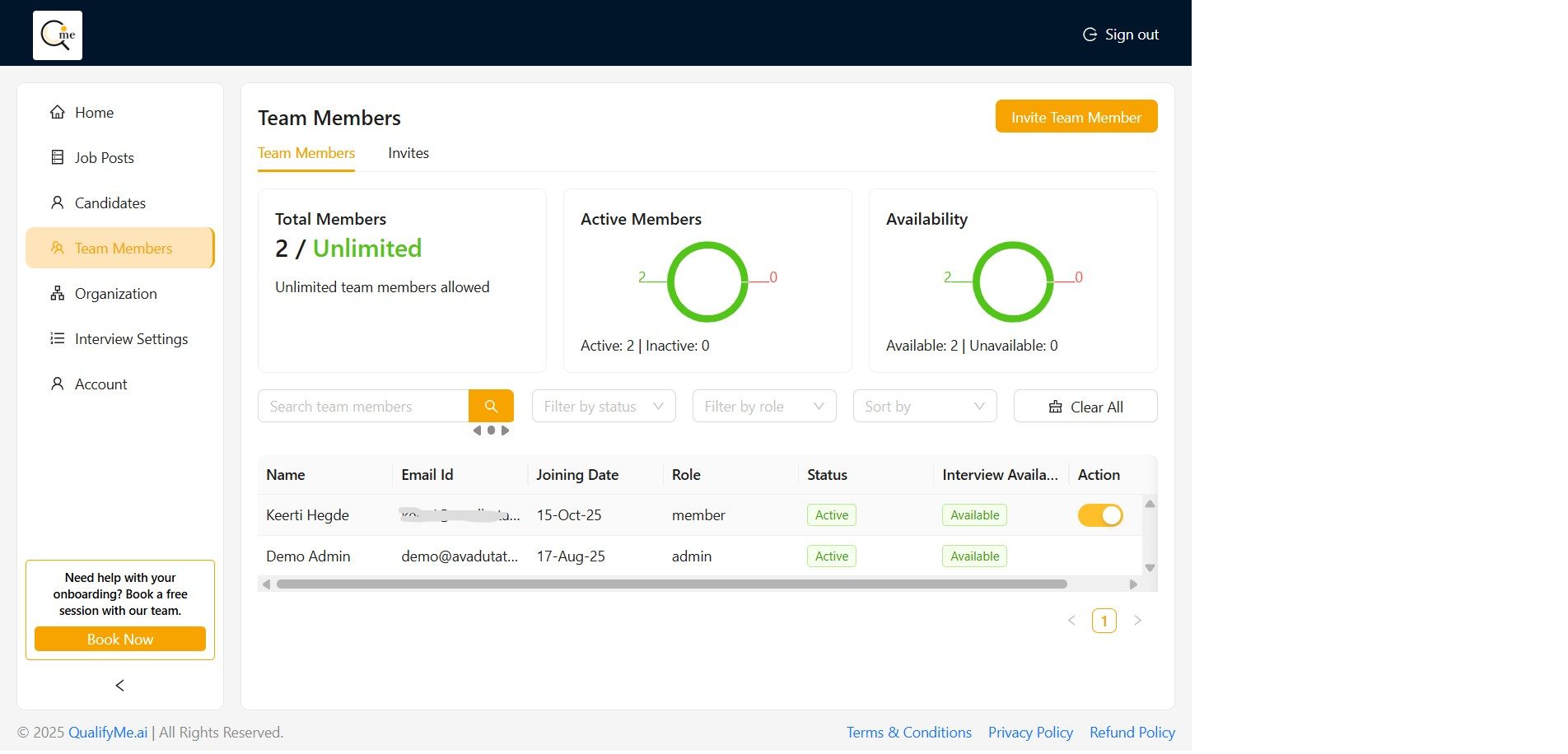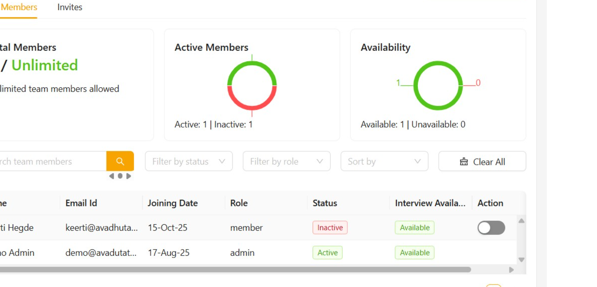 The Team Members page is displayed, showing details like names, roles, and current availability status. Initially, both listed members appear 'Available'.